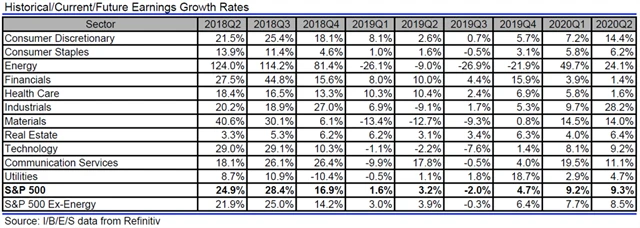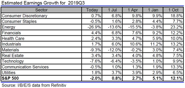 Jak se vyvíjejí odhady růstu či poklesu zisků amerických firem za 3Q2019?