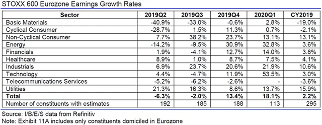 Jak se vyvíjejí odhady růstu či poklesu zisků evropských firem za 3Q2019?