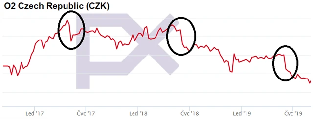 Cenové skoky níže, které jsou patrné na dlouhodobějším grafu, jsou způsobené výplatami dividend, respektive části emisního ážia. Vývoj kurzu v průběhu letošního léta ovšem nelze vysvětlit jen distribucí zisků akcionářům. Obchodníci musejí akciím O2 Czech Republic nevěřit i z jiného důvodu.