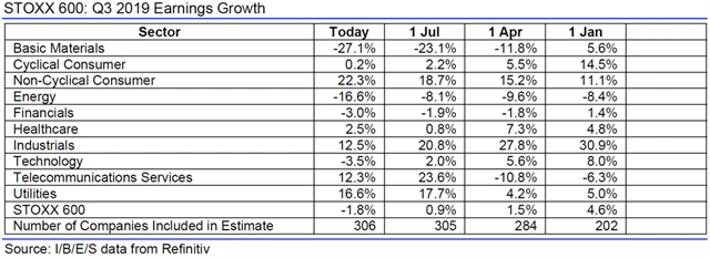 Jak se vyvíjejí odhady růstu či poklesu zisků evropských firem za 3Q2019?