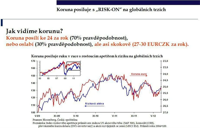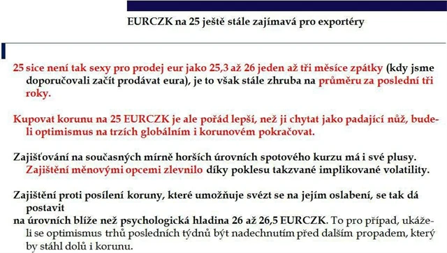 Česká koruna se na vlně optimismu na globálních trzích přibližuje úrovni 25 korun za euro. Prolomení této psychologické hladiny by otevřelo dveře ke 24,6 a hlavně ke 24 (psychologická bariéra po většinu roku 2011). Neúspěšný průlom, nedojde-li k plnokrevné rally na rizikových aktivech ve světě, by naopak znamenal riziko oslabení koruny, potenciálně skrze psychologickou hladinu 26 až 26,5 koruny za euro.