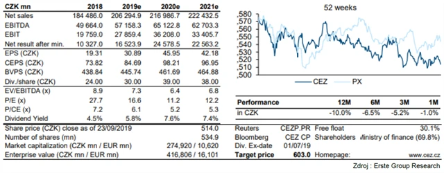 Erste Group Bank potvrdila doporučení pro akcie ČEZ na úrovni "akumulovat" s mírně sníženou 12měsíční cílovou cenou 603 Kč na akcii (dosud 632 Kč). Shrnutí doporučení z 26. září 2019 nabízí analytik Petr Bártek z České spořitelny.