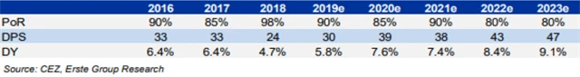 Vyšší dlouhodobé očekávané ceny elektřiny jsou kompenzovány nižšími projektovanými zisky v distribuční síti. Akcie ČEZ jsou ale každopádně dobrou dividendovou sázkou. Firma při aktualizaci strategie oznámila zúžení výplatního poměru z 60-100 % na 80-100 % upraveného čistého zisku. Erste předpokládá dividendový výnos 5,8 % za rok 2019 a jeho nárůst na 7,5 % v letech 2020-2021 při zhruba 90% výplatním poměru. Příjmy z prodeje aktiv by navíc mohly vyústit v mimořádnou dividendu v letech 2021-2022.