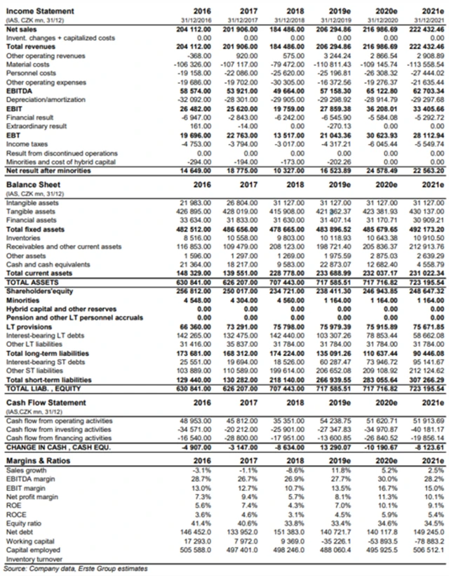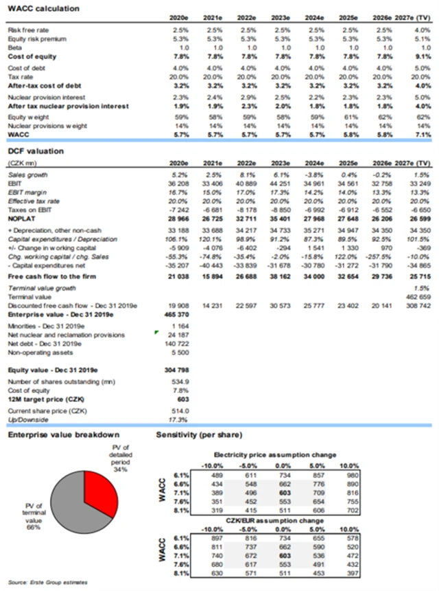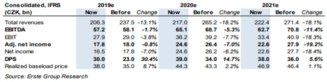 V roce 2019 se do výsledků jednorázově negativně promítají náklady na prohraný soudní spor s SŽDC (-1,1 miliardy Kč) a téměř 3měsíční neplánovaná odstávka 2. bloku jaderné elektrárny v Dukovanech (-0,9 miliardy Kč na úrovni EBITDA). Přesto Erste očekává splnění výhledu firmy pro rok 2019 na spodní hranici rozpětí a v horizontu pěti let čeká růst EBITDA o 8,5 % CAGR.