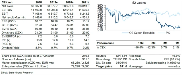 Akcie O2 Czech Republic po nedávných poklesech nabízejí téměř 10% dividendový výnos. Hospodaření firmy se přitom aktuálně vyvíjí příznivě. Vzhledem k posunutí horizontu predikce Erste o rok a vzhledem k nedávné výplatě dividendy (včetně emisního ážia 21 Kč na akcii) jsme snížili cílovou cenu z 271 na 241 Kč za akcii. Firma totiž postupně optimalizuje poměr dluhu na vyšší úroveň prostřednictvím výplaty dividend.