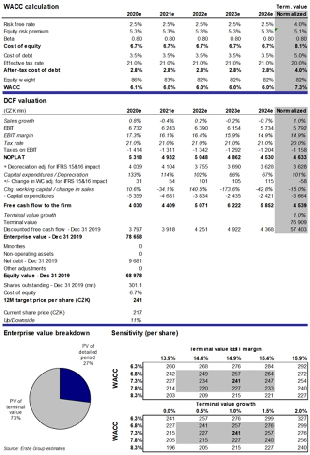 Erste naopak zvyšuje odhad kapitálových výdajů (CAPEX) kvůli nákladům na televizní obsah a očekávaným nákladům na 5G spektrum na Slovensku v roce 2021. Rozvaha firmy je nicméně stále silná (čistý dluh na úrovni 0,8násobku EBITDA pro rok 2019).