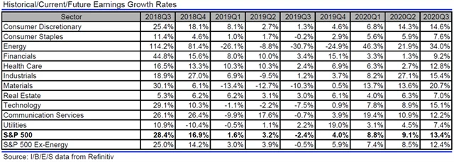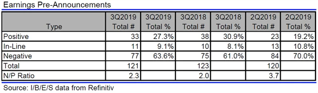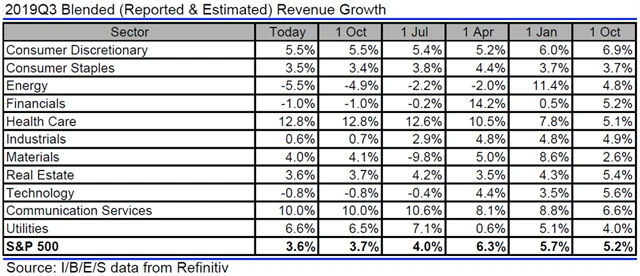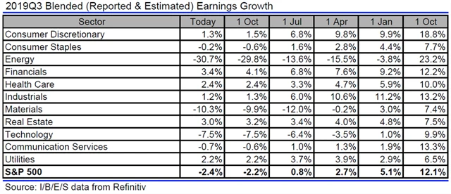 Jak se vyvíjejí odhady růstu či poklesu zisků a tržeb amerických firem za 3Q2019?