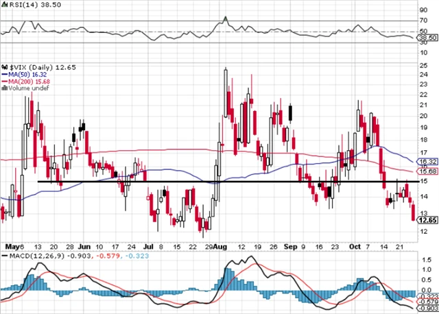 Index volatility VIX se drží na nízkých úrovních a pro akcie vysílá býčí signál. Případná změna může nastat až po nárůstu indexu nad 15.