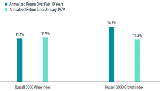 Jak ovšem upozorňují analytici z Dimensional Fund Advisors, problémem není to, že by růst hodnotových akcií byl slabý, ale spíše to, že posilování růstových akcií bylo neobvykle silné. Od roku 1979 přidávají hodnotové akcie v průměru 11,9 % ročně, zatímco růstové v průměru jen 11,3 %.