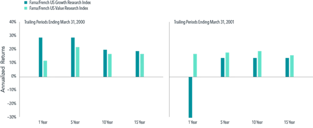 Jako příklad uvádějí březen 2000, kdy růstové akcie porážely hodnotové tituly v ročním, pětiletém, desetiletém i patnáctiletém horizontu. O rok později již byly hodnotové akcie před růstovými ve všech těchto čtyřech horizontech.