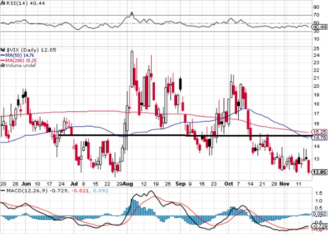 Index volatility VIX je stále na letošních minimech, pro akcie tak stále vysílá optimistický signál. Při poklesech cen akcií se odráží výše, ale zatím v pro býky velice komfortním pásmu.