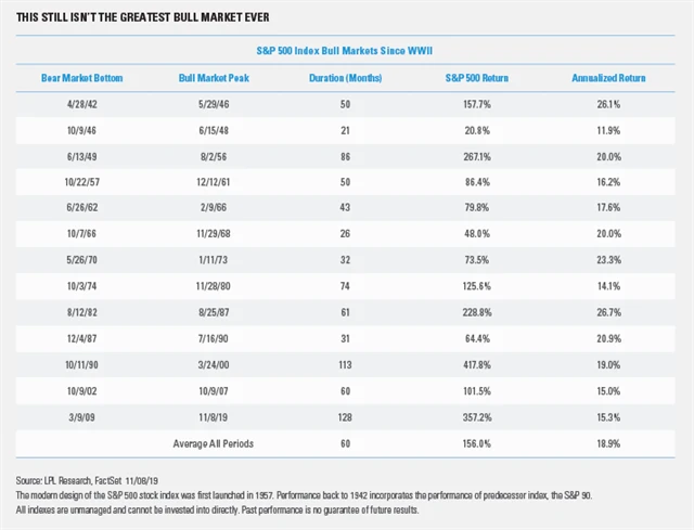 "Podle řady lidí, kteří nestudují tržní historii, je současný býčí trh v USA největší v historii. Není to však pravda, byť již trvá neuvěřitelných více než 10 let," píše Ryan Detrick z LPL Financial. "Zhodnocení o 357 % (k 8. listopadu 2019) je sice impozantní, ale v 90. letech americké akcie posílily dokonce o 417 %."