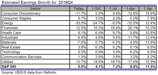 Jak se vyvíjejí odhady růstu či poklesu zisků amerických firem za 4Q2019?