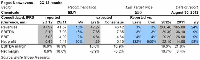 Výrobce netkaných textilií Pegas Nonwovens ve druhém kvartálu 2012 zvýšil meziročně tržby i provozní zisk a dokázal se vyhnout čisté ztrátě, kterou očekávali analytici. Navíc potvrdil svůj celoroční výhled růstu EBITDA o 5 až 15 %.