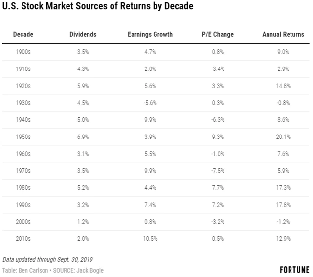 Bogle rozdělil tyto komponenty na jednotlivá desetiletí od začátku 20. století. Ben Carlson ze společnosti Ritholtz Wealth Management pak doplnil údaje do třetího čtvrtletí 2019.