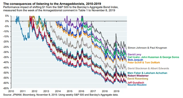 Vzal jejich nepříznivé akciové výhledy a vypočítal, co se od data těchto předpovědí stalo s hypotetickým jedním dolarem přesunutým z akciového indexu S&P 500 do kvalitních dluhopisů (Barclays Aggregate Bond Index). Graf shrnuje situaci výmluvně, ztráty dosahují až 60 %.