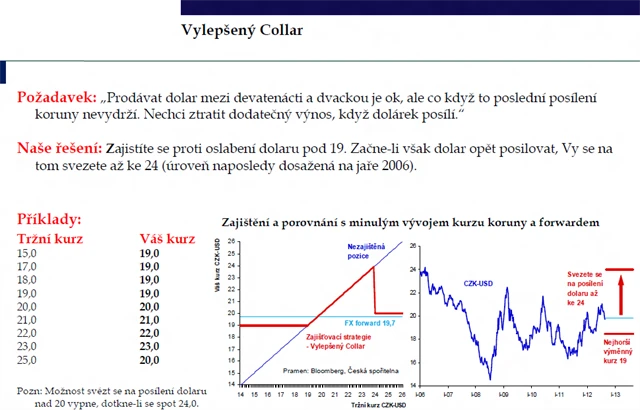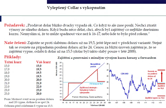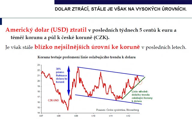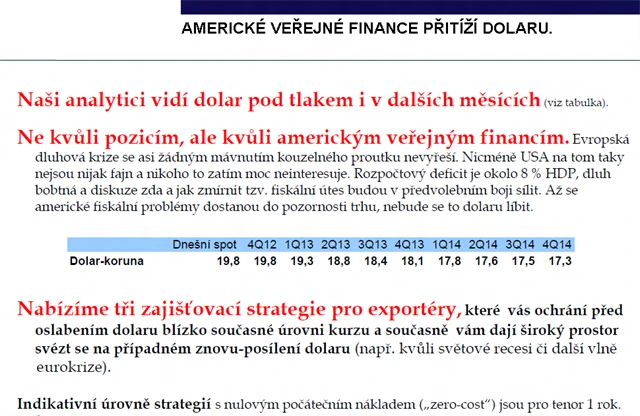 Sázky na posílení amerického dolaru jsou aktuálně asi popadané pod stolem, americké fiskální problémy jsou na obzoru. Americká měna je ovšem i přes ztrátu zhruba pěti centů vůči euru a skoro koruny a půl vůči české koruně z posledních týdnů poblíž svých několikaletých maxim. Dolar by proto měl v dalších čtvrtletích spíše oslabovat. Nevyhovuje vám to? Tak se zajistěte proti jeho propadu.
