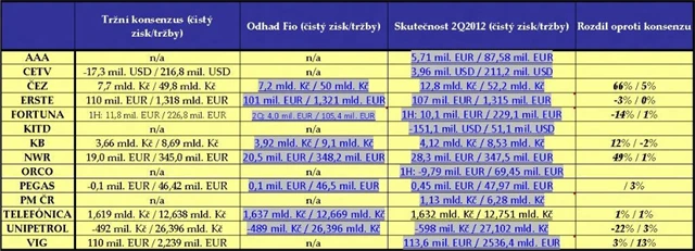 Velmi dobrými výsledky se pochlubila Komerční banka. Kvartální čistý zisk 4,12 miliardy Kč patří k nejlepším výsledkům v historii banky, zisk za první polovinu roku ve výši 7,6 miliardy Kč je historicky vůbec nejlepší. Přestože úrokové marže nejsou za současné situace na trhu ideální, růst úvěrového portfolia meziročně o 8 % pomohl vylepšit provozní výnosy a společně se ziskem z finančních operací zastínil pokračující pokles příjmů z poplatků. Vedení se nadále daří držet náklady pod kontrolou, když ve 2Q2012 meziročně mírně poklesly.