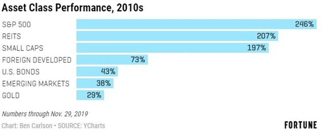 První desetiletí 21. století bylo pro americké akcie jedním z nejhorších v historii, druhé desetileté období naopak bylo jedním z nejlepších. Index S&P 500 posílil o 246 %, a porazil tak všechny další hlavní třídy aktiv. Jistou konkurencí mu byly jen nemovitostní investiční trusty (REITs, +207 %) a akcie podniků s malou tržní kapitalizací (small caps, +197 %).