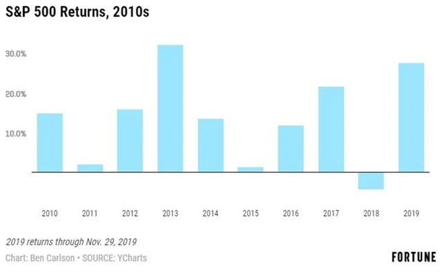 Index S&P 500 vzrostl (včetně dividend) v devíti z deseti let, klesl jen v roce 2018 (-4,2 %), kdy jej do červených čísel srazila medvědí nálada ze závěru roku. Sedm let přineslo dvouciferný procentuální růst, tři roky dokonce posílení o více než 20 %.