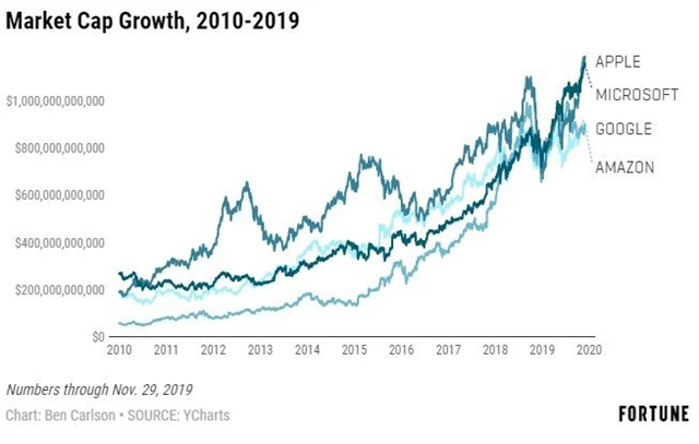 Mimořádně úspěšné desetiletí za sebou mají technologické tituly, index Nasdaq 100 posílil asi o 400 %, což je více než 150 procentních bodů nad indexem S&P 500. Akcie Applu, Amazonu, Microsoftu a Googlu vstoupily do uplynulé dekády s kumulovanou tržní kapitalizací 716 miliard dolarů, do třetí dekády 21. století ale míří s kombinovanou market cap 4,1 bilionu dolarů.