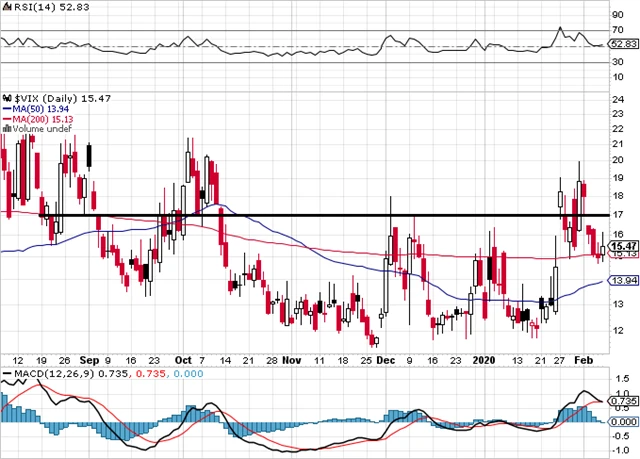 Index volatility VIX se od úterý drží pod 17 a od čtvrtka zhruba na 200denním klouzavém průměru. Při dalším poklesu by vyslal pro akcie jasně býčí signál.