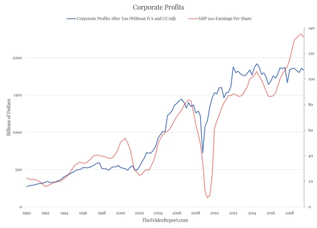 Zhruba před třemi lety se začaly rozevírat nůžky mezi údaji o vývoji zisků amerických společností od vládního Úřadu pro ekonomické analýzy a daty samotných podniků zahrnutých v indexu S&P 500. Zatímco podniky informují o pokračování růstu zisků, Úřad pro ekonomické analýzy předkládá čísla hovořící spíše o jejich stagnaci.