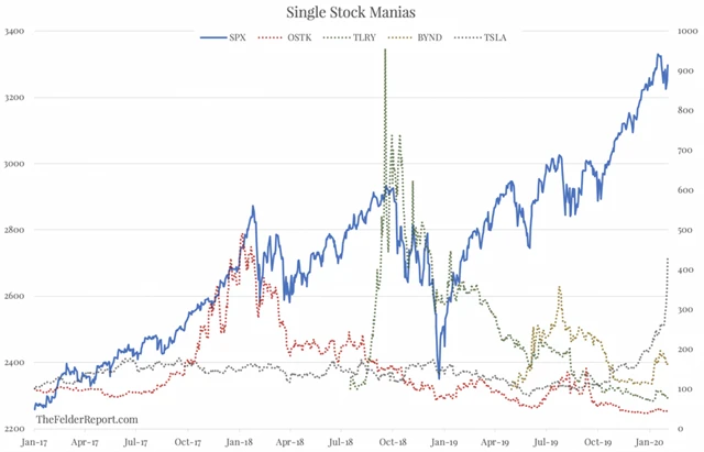 Podle části komentátorů dění na trzích je ovšem Tesla jen další z řady akciových mánií posledních let. Hedgeový manažer a bloger Jesse Felder upozorňuje jen v posledních třech letech na raketové růsty (a pády) akcií firem jako Overstock.com (když se z firmy stala kryptofirma), Tilray (v marihuaně je budoucnost) nebo Beyond Meat (maso z rostlin). "Investoři opravdu rádi každou další 'velkou věc', ať je to cokoli," říká Felder.