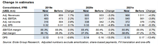 Celkově analytici z Erste snížili výhled pro tržby, upravený provozní zisk EBITDA a zisk na akcii (EPS) o 4-5 %, a to v důsledku uzavření Jumpshotu (a tedy pomalejšího růstu bez této dceřiné firmy) a očekávání o něco nižší klientské základny.