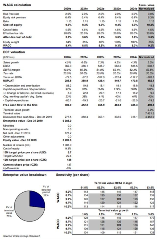 Ocenění modelem diskontovaného cash flow implikuje 12měsíční cílovou cenu 128 Kč za akcii, přičemž pracuje s růstem tržeb o 5,2 % CAGR mezi roky 2019 a 2024, pomalým růstem EBITDA marže, snížením WACC v terminální hodnotě z 10,6 % na 9,3 % v důsledku vyššího podílu cizího kapitálu a dolní hranicí cíle Avastu pro poměr čistého dluhu vůči EBITDA na úrovni 1,5.