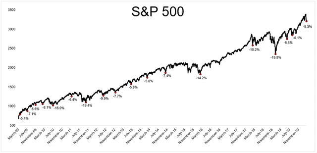 Michael Batnick ze společnosti Ritholtz Wealth Management chápe, proč investory dokážou drobné poklesy cen akcií znervóznit, na druhou stranu ale vysvětluje, že dlouhodobý trend je jasný, takže investují-li lidé se skutečně dlouhým horizontem, nejsou pro ně velkým rizikem ani mnohem hlubší než 5% poklesy.