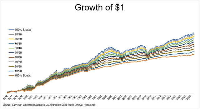 Argumentuje přitom mimo jiné tímto grafem, který ukazuje, že nejvýnosnější je dlouhodobě investování do akcií, a to navzdory vyšší volatilitě akciového trhu.