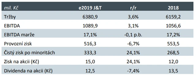 Kofola ČeskoSlovensko - odhad výsledků za r. 2019, zdroj: J&T Banka
