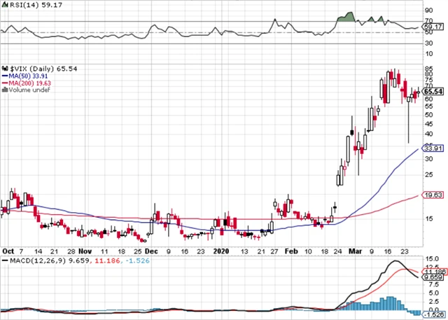 Index volatility VIX je na stejné úrovni jako před týdnem. Výrazné výkyvy pokračují, i když zatím bez nových maxim, a kolísavost je extrémně vysoká. Napětí na trzích nejspíše v nejbližší době nepoleví.