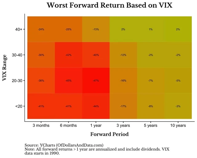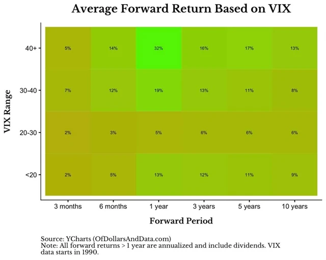 Následující graf ukazuje průměrnou následnou výkonnost indexu S&P 500 v horizontu od tří měsíců do 10 let v závislosti na dosahovaných hodnotách indexu VIX. Evidentní přitom je, že nejlepších výkonů index nedosahuje, když je na trhu klid, ale právě naopak poté, co VIX dosáhne vysokých, ne-li extrémních hodnot.