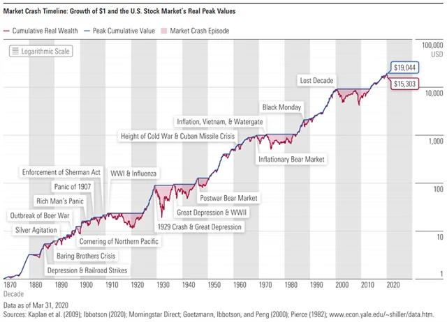 V dlouhodobém horizontu se investování do akcií vyplácí. To ilustruje i graf vývoje hodnoty jednoho amerického dolaru zainvestovaného do akcií v roce 1870. Za 150 let se tato investice zhodnotila na více než 19 000 dolarů. S příchodem pandemie koronaviru se hodnota této investice snížila na 15 300 dolarů. Současný dolar sice není ten samý jako dolar z roku 1870, i tak je ale jistě lepší tento dolar mít zainvestovaný v akciích než schovaný v matraci.