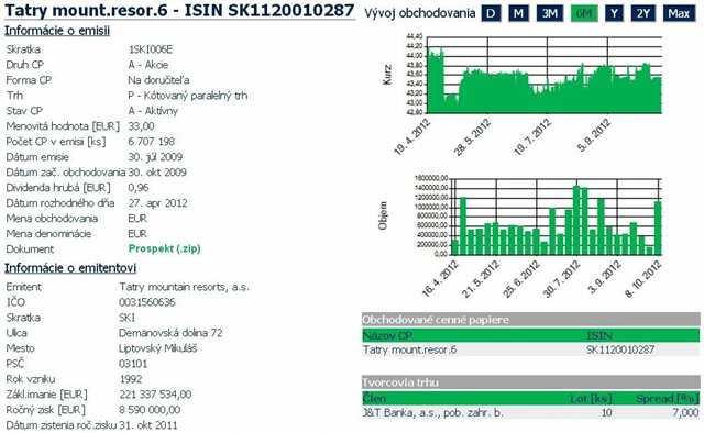 Za posledních šest měsíců se akcie TMR na bratislavské burze pohybují mezi 43 a 44 EUR za kus. Spolumajitel TMR Igor Rattaj v úspěch na pražské burze věří kvůli pronájmu Špindlerova mlýna, který společnost získala od ČSTV na 20 let. V Polsku jedná TMR o pronájmu části polských Tater, ale zatím neúspěšně. Za firmou TMR stojí nejen na Slovensku, ale i v Čechách J&T Banka.