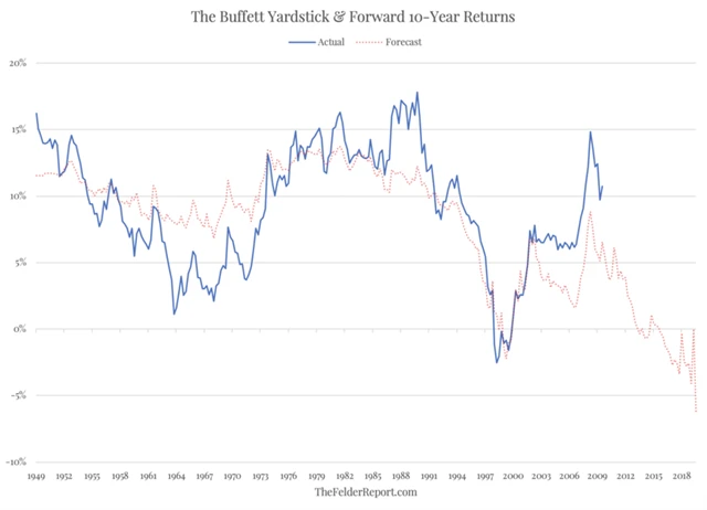 Modrá křivka v dalším grafu reprezentuje výkonnost amerických akcií (průměrná roční výkonnost v desetiletém horizontu), tečkovaná červená zobrazuje inverzně poměr celkové tržní kapitalizace amerických akcií k HDP Spojených států. Tento graf tak naznačuje, že současné míry zhodnocování investic na akciovém trhu jsou neudržitelné a že by modrá křivka měla zamířit dolů.