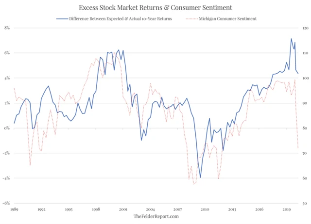 Jak nicméně upozorňuje známý hedgeový manažer a bloger Jesse Felder, nakonec by to nemusela být až taková tragédie. Asi od roku 2003 se tyto křivky začaly poměrně výrazně oddalovat, což lze podle Feldera vysvětlit jednoduše tak, že když jsou trhy přehnaně optimistické, akcie dosahují vyšší než očekávané výkonnosti, a naopak.