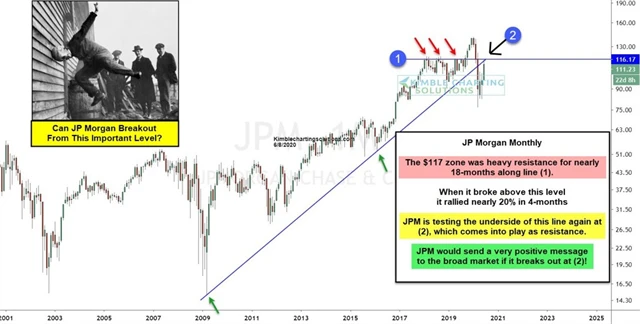 Akcie JPMorgan v letech 2018 a 2019 dlouho nedokázaly prorazit nad rezistenci okolo 117 USD. Jakmile se jim to podařilo, přidaly za čtyři měsíce bezmála 20 %. Letošní koronavirový výplach je ale srazil zpět pod tuto úroveň. Nyní opět testují "starou" rezistenci.