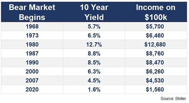 V srpnu 1987, kdy americké akcie dosáhly vrcholu před následným propadem během takzvaného černého pondělí, dosahoval výnos 10letých amerických vládních dluhopisů 8,8 %. V říjnu to bylo dokonce 10,2 %. Předtím, než mezi roky 1968 a 1970 americké akcie spadly o více než 36 %, dosahoval výnos 10letých amerických dluhopisů 6 %, a předtím, než mezi roky 1973 a 1974 index S&P 500 klesl na polovinu, činil výnos 10letých bondů 6,5 %. A třeba v roce 1990, kdy se americké akcie propadly o 20 %, dluhopisy vynášely téměř 9 %, v době splasknutí internetové bubliny 6 % a před finanční krizí z roku 2007 přes 5 %.