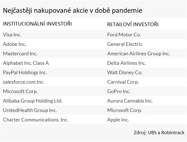 Profesionálové a amatéři měli odlišné preference, pokud jde o akcie. Zatímco profesionální investoři nakupovali společnosti, které působí na perspektivních trzích, amatérští investoři měli zájem hlavně o akcie s největšími cenovými propady. "Z dostupných dat vyplývá, že profesionálové nejčastěji nakupovali společností Visa, Adobe, Mastercard, Alphabet a PayPal. Oproti tomu amatéři projevili největší zájem o Ford Motor, General Electric, American Airlines, Delta Air Lines nebo Walt Disney," říká hlavní ekonom BH Securities Štěpán Křeček.