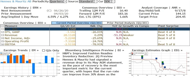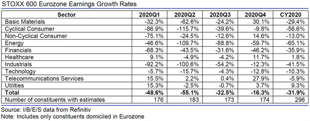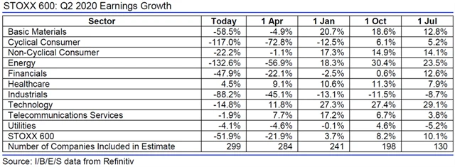 Jak se vyvíjejí odhady růstu či poklesu zisků evropských firem za 2Q2020?