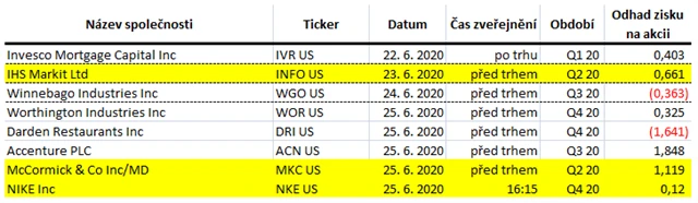 Které světové firmy představí výsledky hospodaření za uplynulý kvartál v týdnu od 22. června a jaké zisky v rámci indexů S&P 500 a STOXX Europe 600 očekávají analytici oslovení agenturami Refinitiv a Bloomberg?