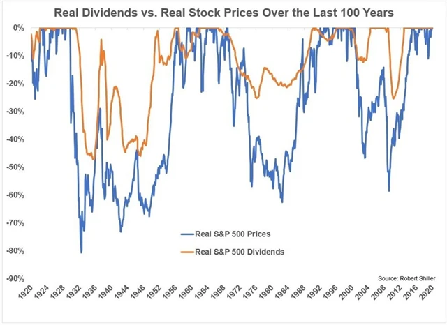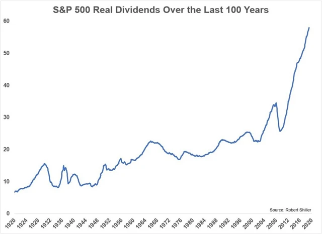 V uplynulých sto letech dosahovalo meziroční tempo inflace ve Spojených státech v průměru bezmála 3 %. Růst dividend společností z akciového indexu S&P 500 byl ale ještě o 2,1 procentního bodu vyšší. Ben Carlson ze společnosti Ritholtz Wealth Management je v tomto kontextu dokonce přesvědčený, že právě dividendy jsou jedním z nejvíce podceňovaných faktorů v investování.