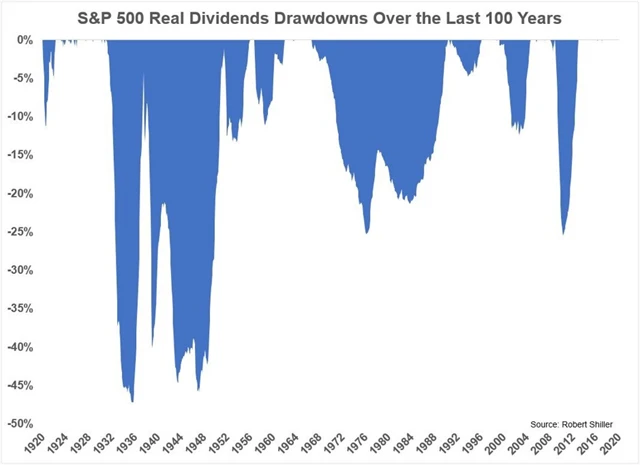 Dividendy v USA v uplynulých sto letech nikdy nespadly o více než 50 %, ačkoli americké akcie ve stejném horizontu zažily minimálně 50% pokles v pěti případech. I v době Velké deprese, kdy americké akcie spadly o 80 %, zaznamenaly dividendy "jen" 47% pokles. Na původní hodnoty se pak vrátily rychleji než ceny akcií.