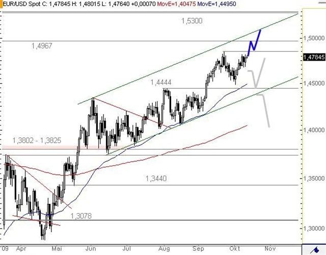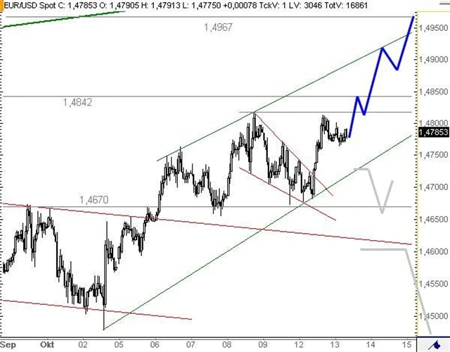 Euro je stále na cestě vzhůru a je připravené prolomit 1,4844 a pokračovat až na 1,4967 – 1,5000. Na hodnotě 1,53000 je však silná úroveň odporu.