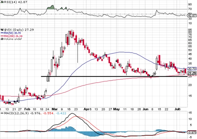 Index volatility VIX se příliš neposunul. Je nad 200denním klouzavým průměrem a nad 25, i přes růst cen akcií tak vysílá spíše negativní signál.