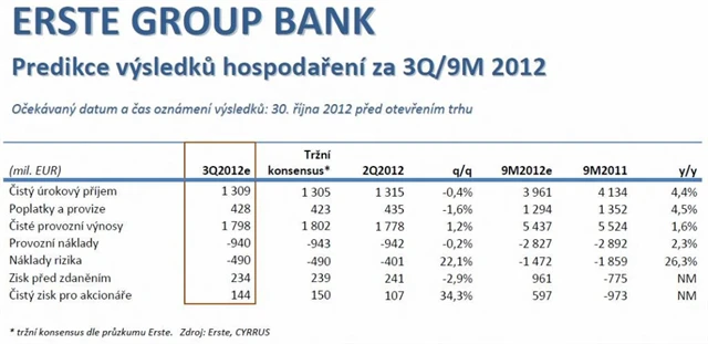 Na rozdíl od mnoha předchozích kvartálů by tentokrát výsledky Erste neměly být ovlivněny tolika významnými jednorázovými položkami a měly by odrážet reálný vývoj hospodaření banky v současném složitém prostředí. Investoři by se měli soustředit především na vývoj provozních výnosů, nákladů rizika (zvláště v problémových zemích Maďarsku a Rumunsku) a případné indikace dalšího odpisu goodwillu v Rumunsku ve 4Q2012.