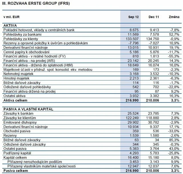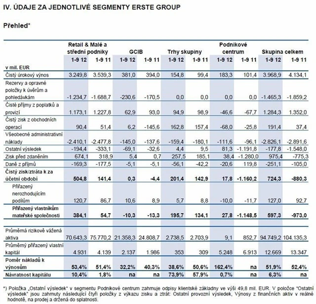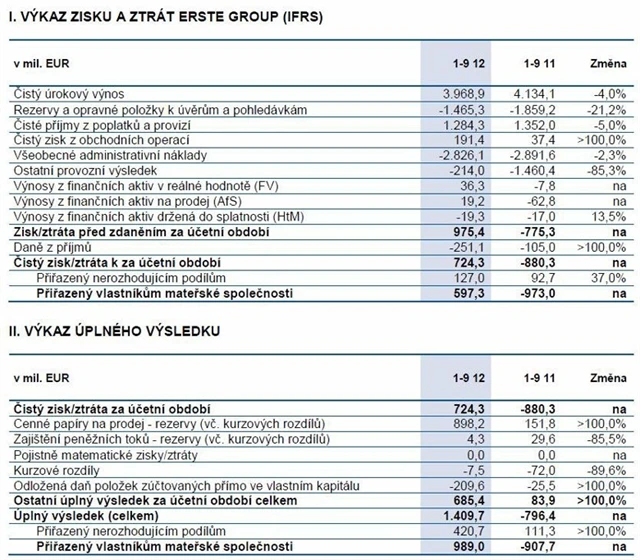 Erste Group ve třetím čtvrtletí 2012 dosáhla čistého úrokového výnosu 1,32 miliardy eur a čistého zisku 143,7 milionu eur, čímž v zásadě naplnila očekávání (1,31 miliardy, respektive 144 milionů eur). Banka potvrdila celoroční náklady rizik 2 miliardy eur. za celý rok očekává mírně horší provozní výsledek než loni. Meziroční srovnání kvartálních výsledků nemá příliš smysl kvůli loni realizovaným jednorázovým odpisům v Maďarsku, Rumunsku a na trhu s CDS.